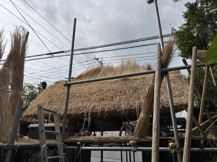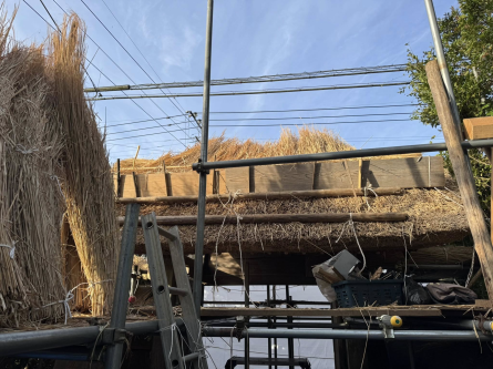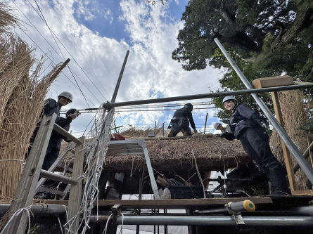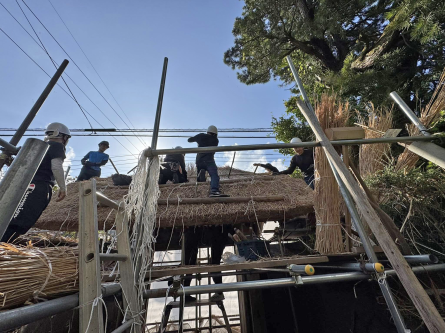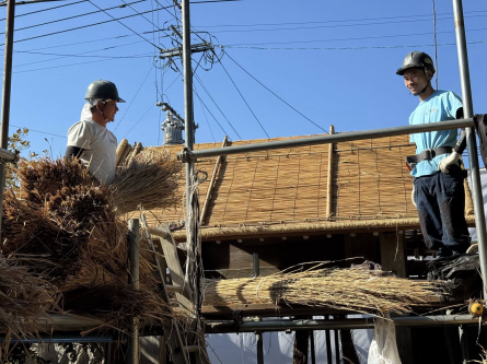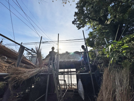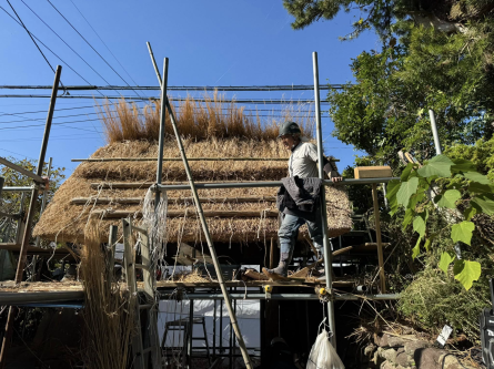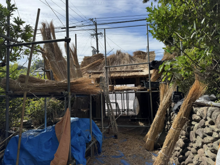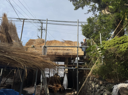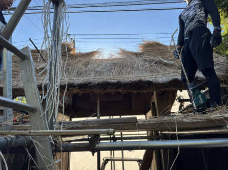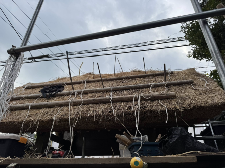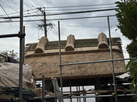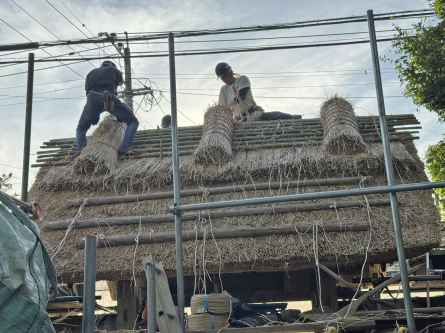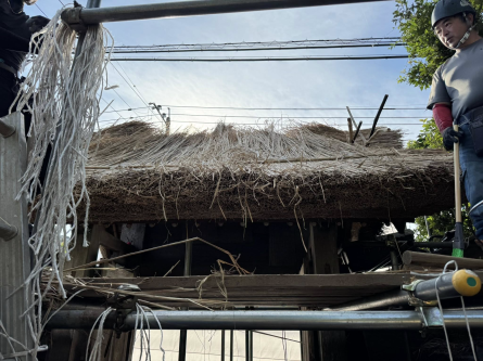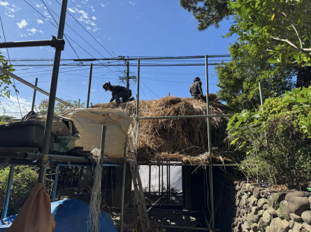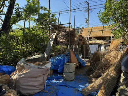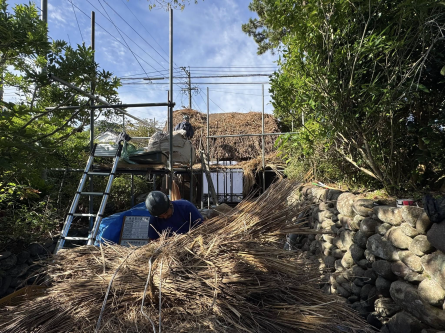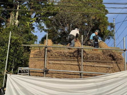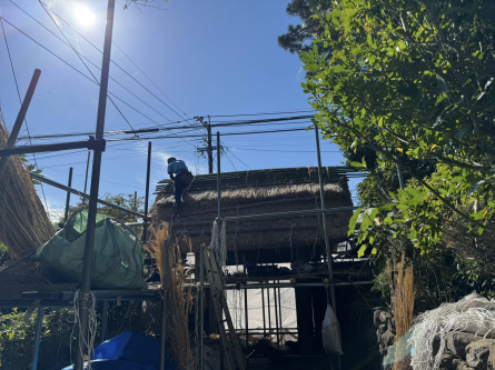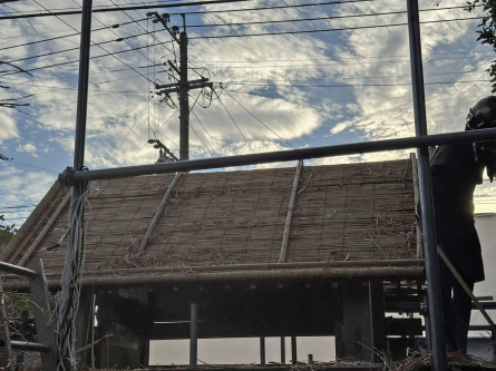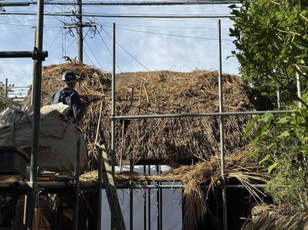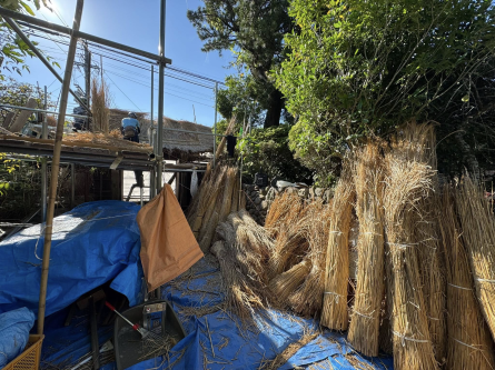 | 今日から新しい茅で屋根を葺き替えて行きます。門の大元になる屋根はとても綺麗でしっかりしています。地元の大工さんの腕がいいのが素人の私でも分かります。新しい茅は古い茅より細くてしなやかな気がします。そして茅を1番下から乗せて葺いています。 |