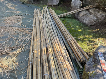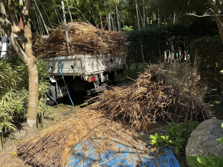 | 本日の入来院の茅葺き門。古い茅を綺麗に剥がし丸裸の門の屋根となりました。それにしても、剥がしてみると沢山の茅の量でした。茅葺きには本当に沢山の茅が必要なのがよくわかります。 |