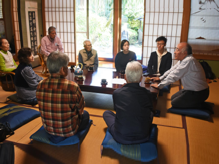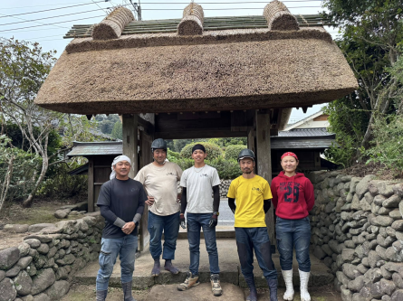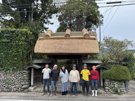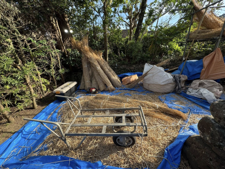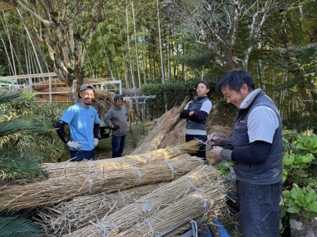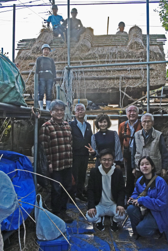 | 本日、文化の日。祭日でも茅門の葺き替え作業は続きます。仕上げ段階に入った模様。午後1時半からは景観アドバイザーの講義があって余裕がなかったので、今日は卵焼きを焼いただけで、さつま揚げメインでおむすび。午後は9名参加の入来花水木会主催、景観アドバイザー派遣での講義となり、伝健保存会地区の景観における観光のあり方(勿論茅葺きに関する専門的な貴重なお話も)について有意義なお話をお聞きしました。集合写真(7枚目の縦長の写真)は、茅門作業の4人と一緒に撮影。先生方が帰られた後に門の作業を撮影しましたが、今日はネコと呼ばれる1番上の茅を屋根に乗せていました。こんなに大きなネコは初めて!と阿蘇茅葺工房の社長さんがおっしゃいましたが、我が家の門の写真を見て、同じように作ってくださっています。表のシートも少し外して、道路側からも撮影できました。さぁ、明日の仕上げが楽しみ。 |