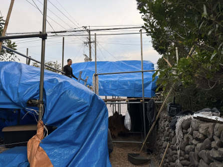 | 4人の作業員さん達に毎日お昼を手作りして差し上げております。牛丼、カレーライス、豚丼に続いて本日は親子丼。️丼もめちゃ大きいサイズでございます。慌てて作り上げたので見栄えが悪いのですけど、味はよろしいので、完食してくださいました。モリモリ食べていただき頑張って作業してもらってます。明日は雨ということで、葺き替え途中の門に、雨よけのシートを被せて本日の作業は終了いたしました。 |