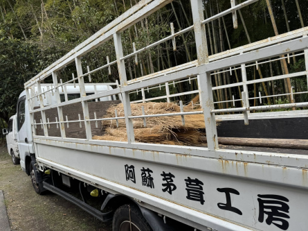 | 今日は午前中外出していて、門の撮影はあまり出来ていませんが、今朝、熊本から茅を積んできたトラックの茅がほんの少し残ってるのを確認し、もう葺き替えは仕上がるのだろう・・・と思っていました。夕方帰宅したら、とても綺麗に仕上がっていたので、父は車から見て感激していました。阿蘇茅葺工房さんには本当にお世話になりました、昔の茅門の写真を参考に、一生懸命仕上げてくださり感謝しております。とにかく、若者がこの茅葺き作業をしている姿に日本伝統文化の明るい未来を感じます。 |